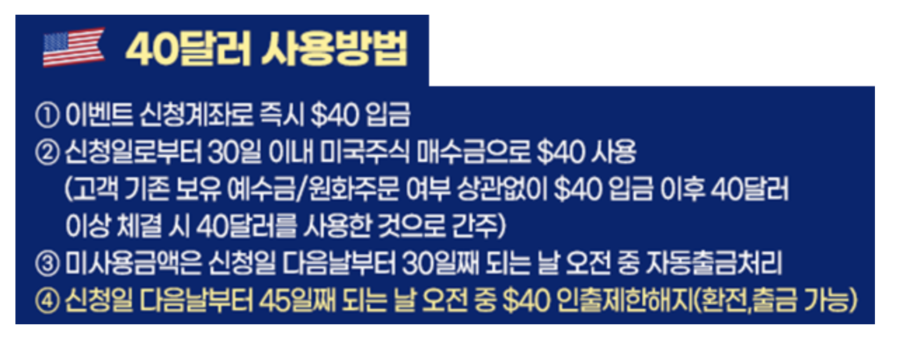 신청을 하게되면 바로 40$가 입금되며 미국주식 거래시 사용하실 수 있다고 합니다.